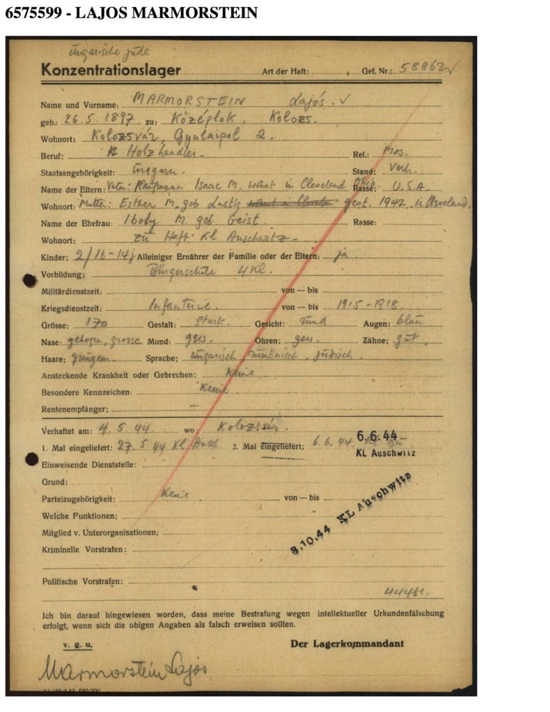 Lajos’s Auschwitz entry paperwork records many of the same things a typical application for a driver’s license or a passport might. There’s his physical description: height, weight, hair and eye color (as well as some anti-Semitic categories like “nose”). There’s information about his home address, the date he was deported, and his “category”—in his case, Hungarian Jew. There are blanks for level of education (“Bürgerschule 4Kl””), profession (“lumber jack”), and military service (“infantry). The most striking entry, though, is under the category of “Parents.” Here, the name of Izsak and Esther Marmorstein are duly recorded, as are their birth years. There’s one final blank, for their place of residence, their Wohnort. The answer stuns me. “Cleveland, Ohio, U.S.A.” It’s the truth, but somehow seeing it on this form leaves me speechless. It makes explicit the connection I’ve known from the start. It draws a straight line from a Nazi death camp to the immigrant family in Cleveland that I grew up with. For Lajos, entering a German camp system he would never leave, it must have been a dark moment to think that he had been there, with them. Now, though, he was at Auschwitz.